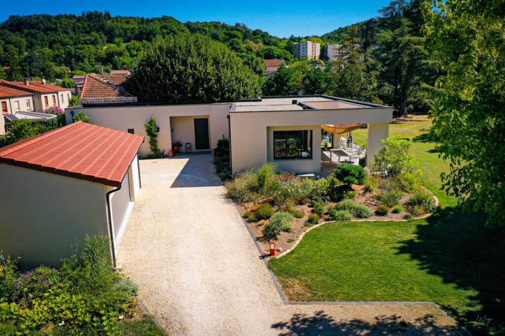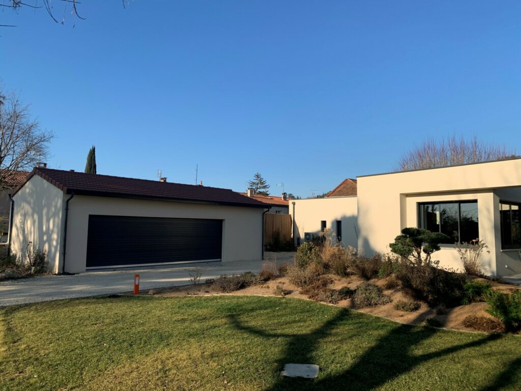 Un garage de 60 m² avec une porte de garage sectionnelle de 7m de largeur vient compléter cette extension contemporaine !